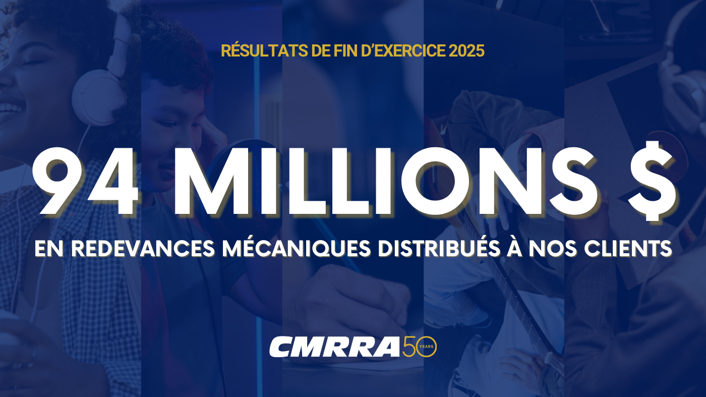 TORONTO, Canada — L’Agence canadienne des droits de reproduction musicaux (CMRRA), chef de file dans le domaine de l’octroi de licences et de la gestion de redevances, a annoncé aujourd’hui la distribution de plus de 94 millions de dollars de redevances à ses clients éditeurs de musique et auteurs-compositeurs et auteures-compositrices indépendants pour l’exercice 2025, et ce, dans la foulée de son 50e anniversaire.